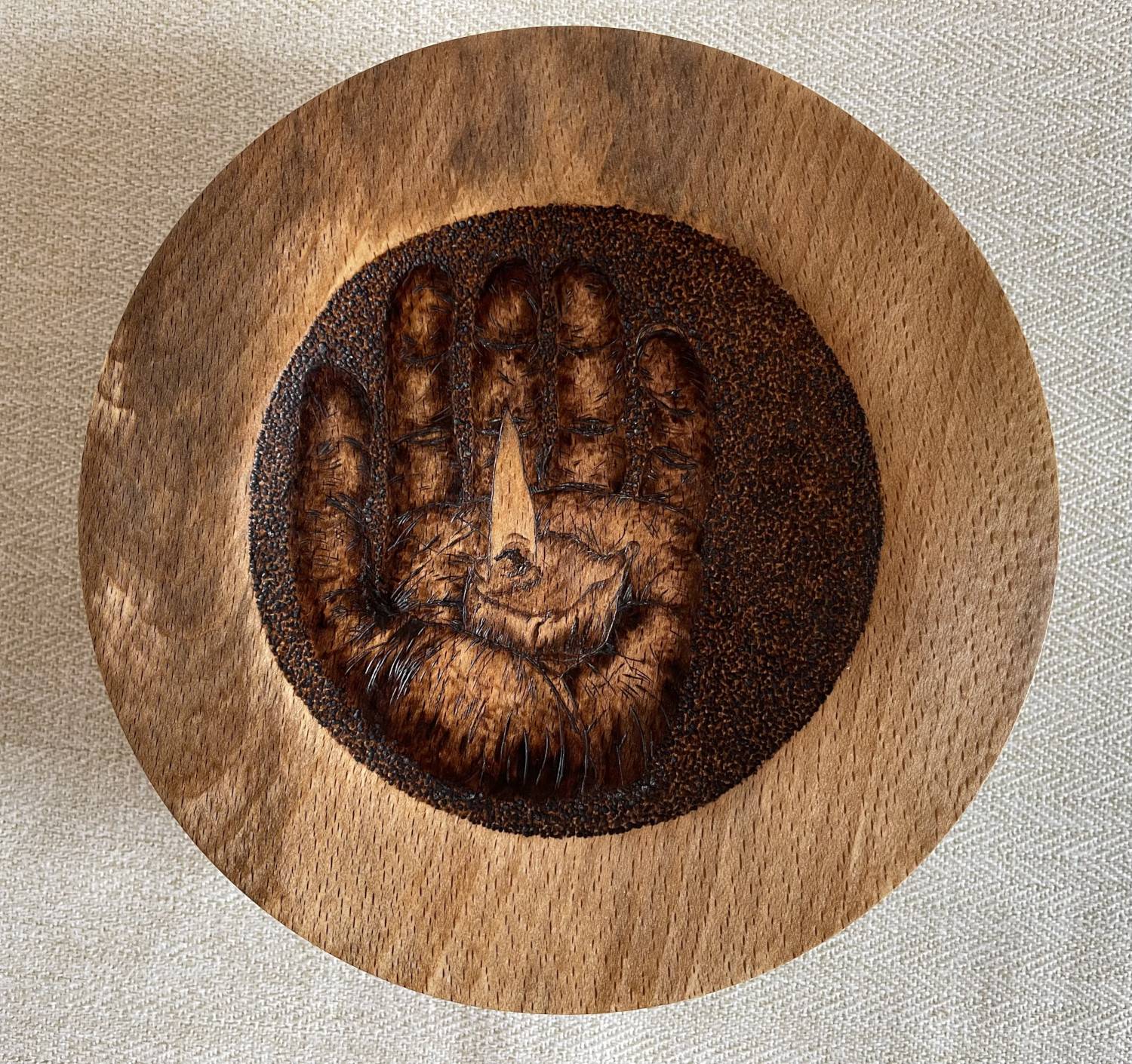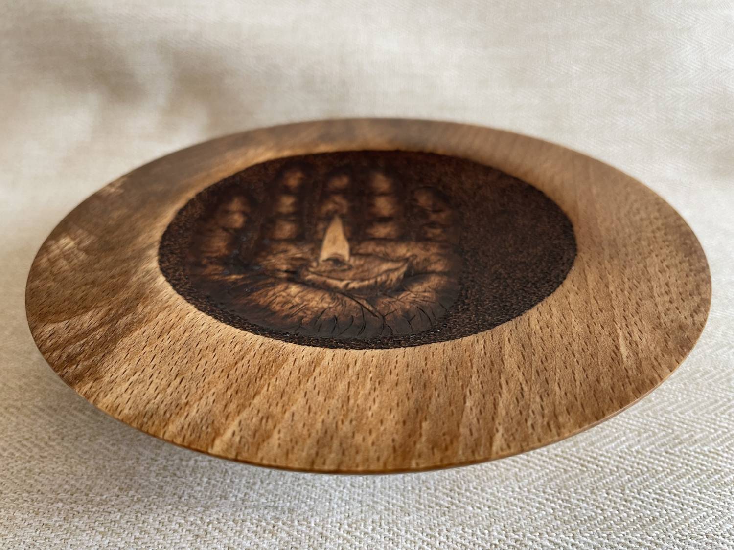 It is a Beech platter that I have hand turned, Penny has then used pyrography to draw the detail