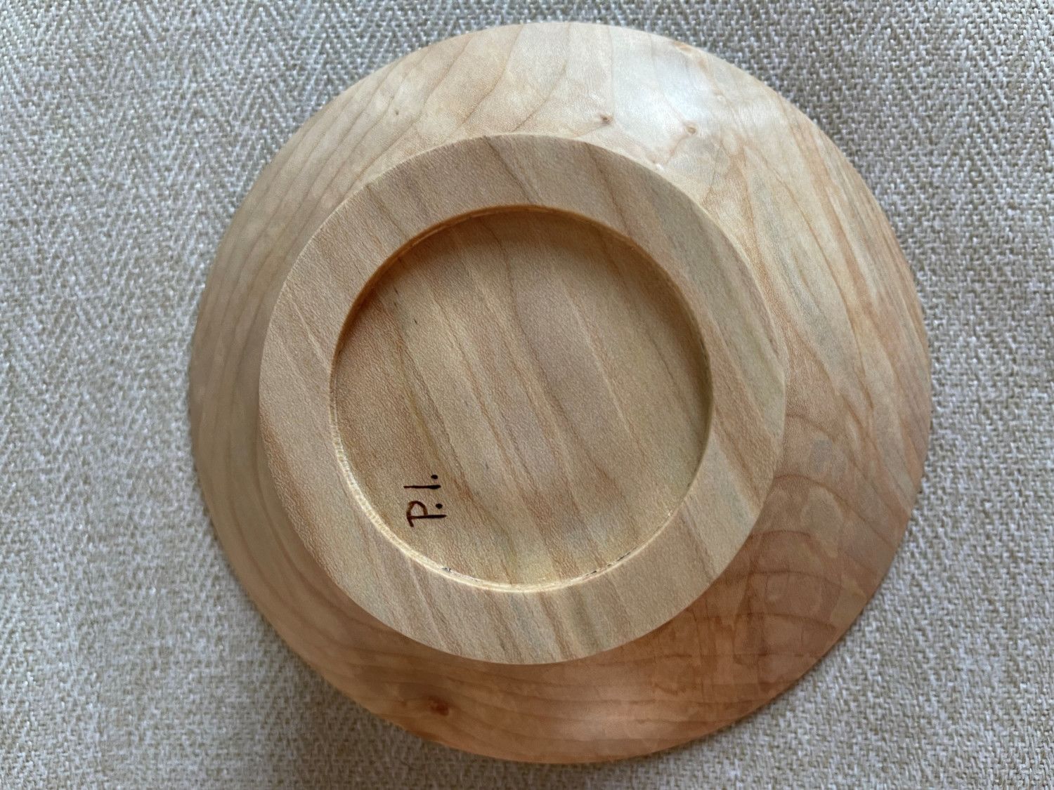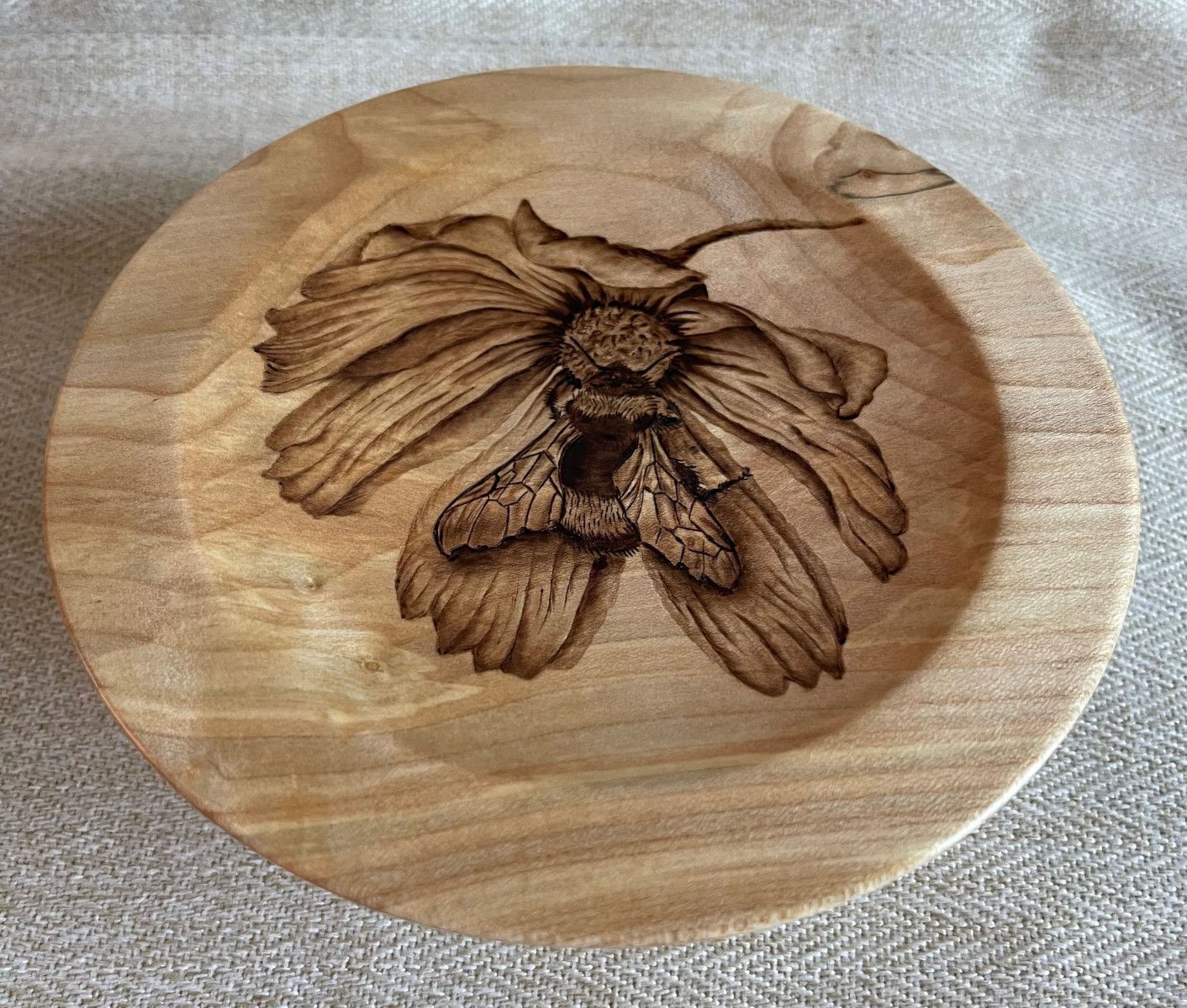 a medium sized bowl with a bee on a flower drawn in the centre using pyrography