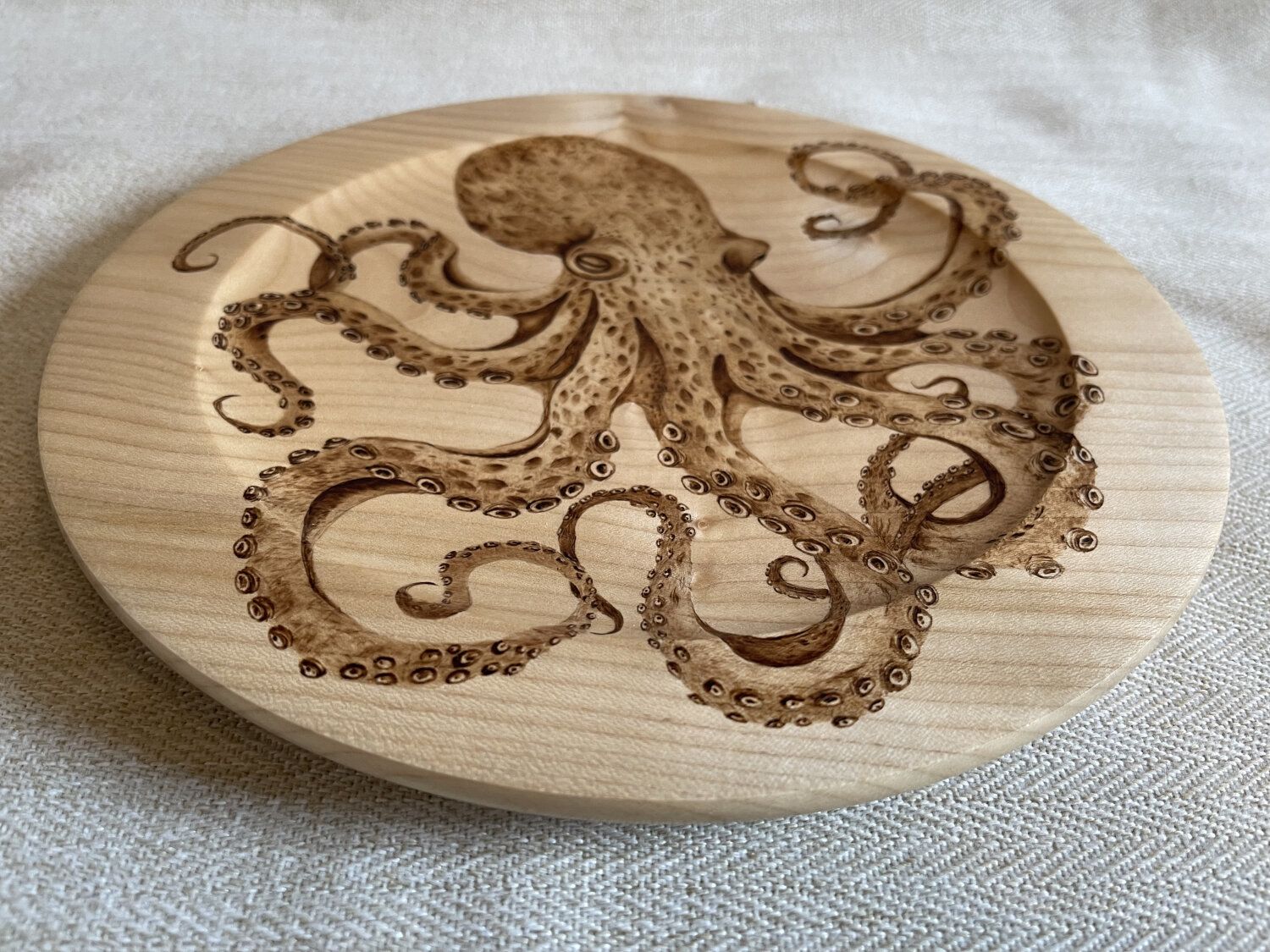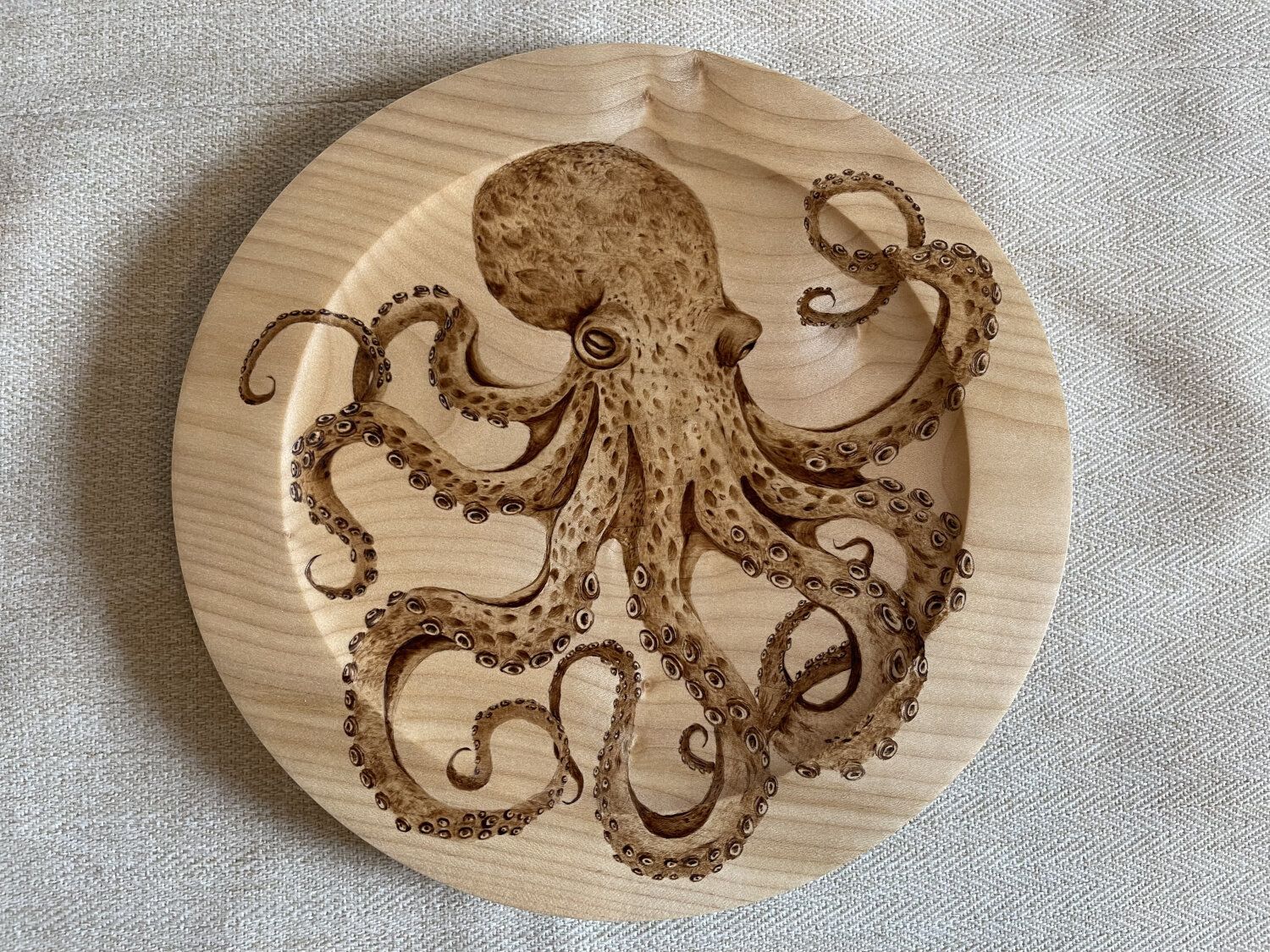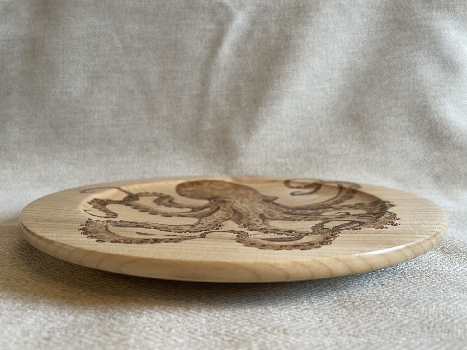 It is a Sycamore platter that I have hand turned, Penny has then used pyrography to draw the detail
