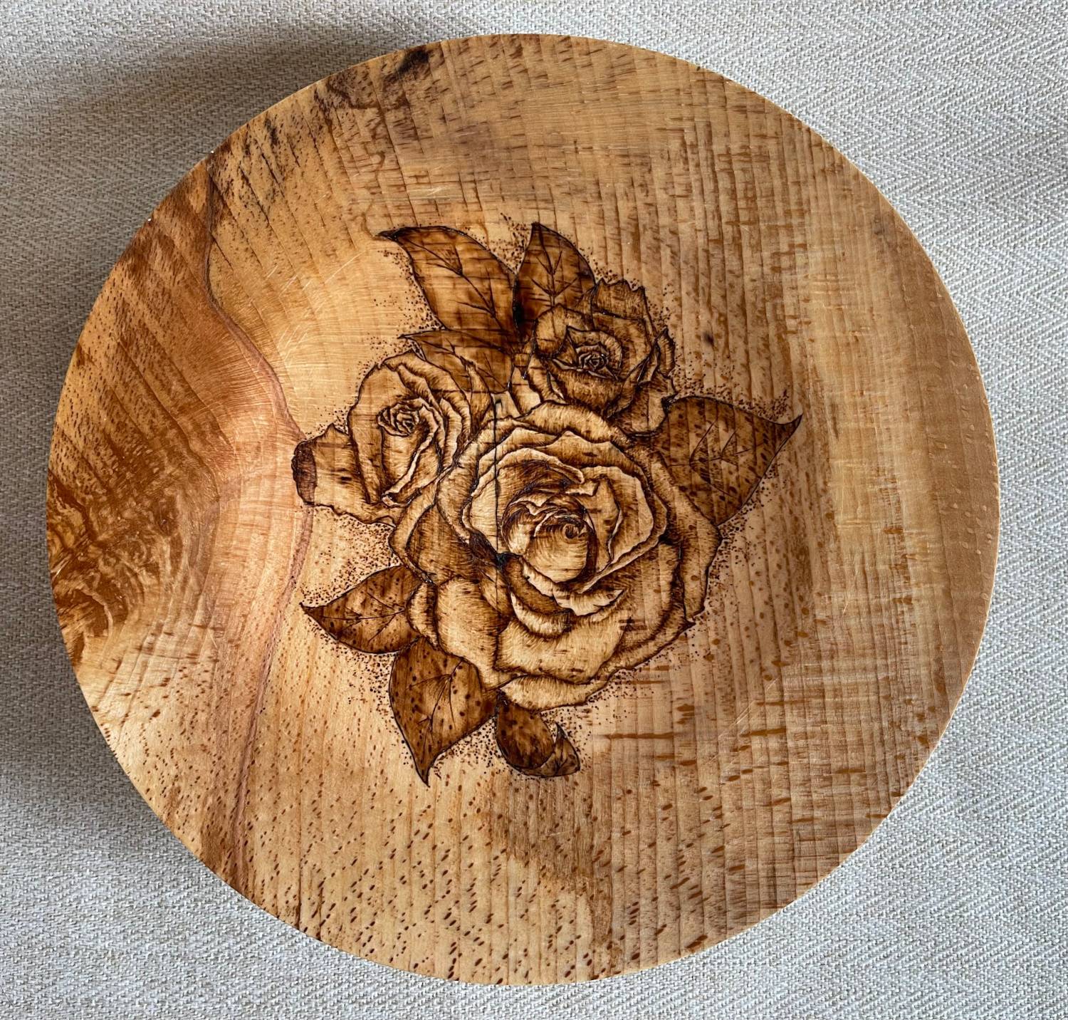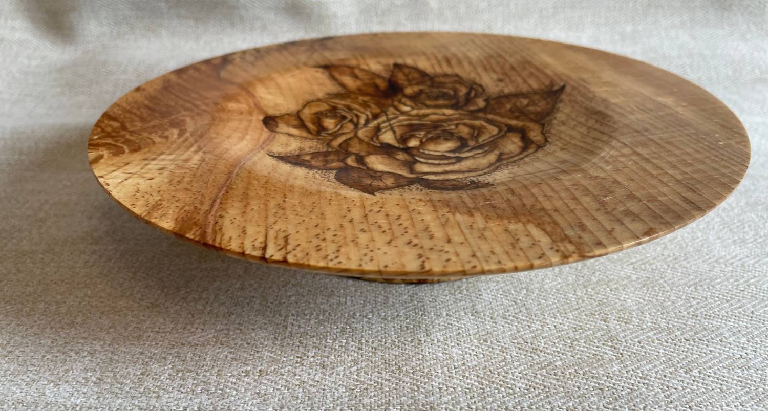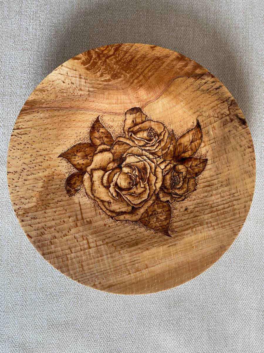 It is a Beech platter that I have hand turned, Penny has then used pyrography to draw the Roses